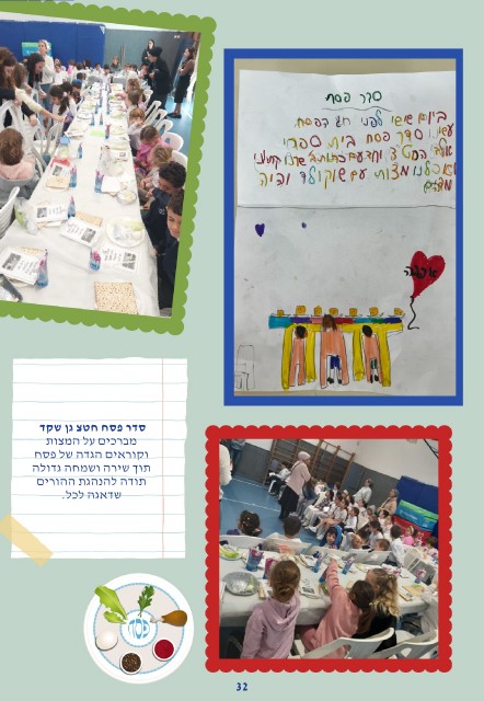 סדר פסח חטצ גן שקד מברכים על המצות וקוראים הגדה של פסח תוך שירה ושמחה גדולה תודה להנהגת ההורים שדאגה לכל. 32